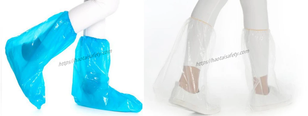- Haotai Disposable boot covers are the most economical and effective solution to keep your shoes dry and protected. Clear covers are suitable for all kinds of shoes. One size fits all. Made from a low-density chlorinated polyethylene fabric with an anti-slip, coating on the sole our boot covers resist tearing and rupturing. Elastic band provides snug and comfortable fit around shoes. Easy-on and easy-off, breathable and lightweight.